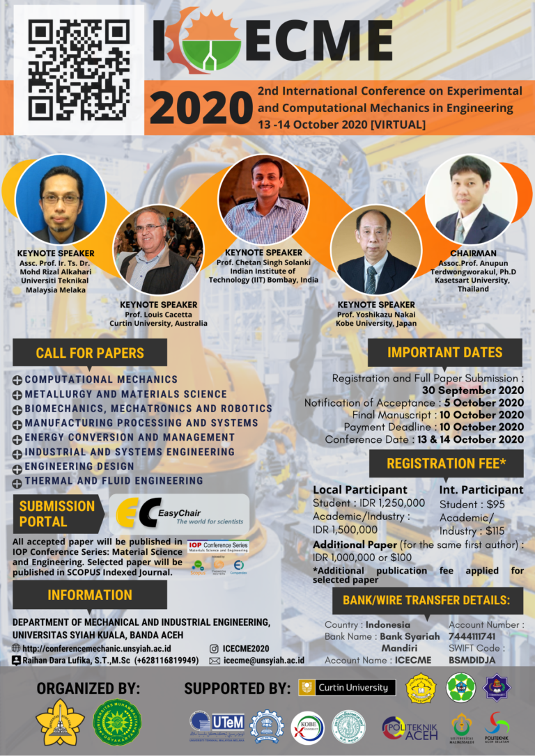 All accepted and presented papers of the International Conference on Experimental and Computational Mechanics in Engineering (ICECME) 2020 will be submitted and published in the Open Access Publisher: IOP Conference Series: Material Science and Engineering (MSE) which normally will be indexed by Conference Proceedings Citation Index – Science (CPCI-S) Thomson Reuters, Web of Science, EI Compendex, and SCOPUS SciVerse. All papers published in IOP Conference Series are fully citable and upon publication will be free to download in perpetuity.